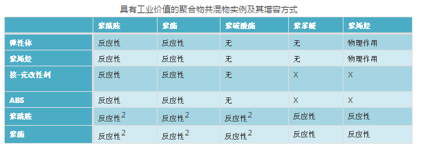 X——表示此類(lèi)共混物的文獻(xiàn)報(bào)道較少;無(wú)——表示不需要有效增容即可獲得有用的聚合物共混物;反應(yīng)性2——表示共混物之間共混時(shí)可原位生成有用的接枝或嵌段共聚物提高組分間的相容性